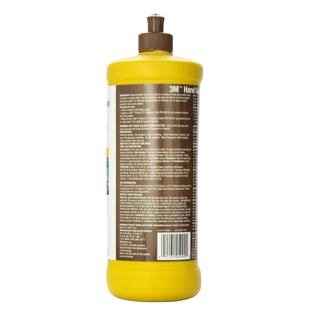 Enhance your vehicle’s shine with 3M Hand Glaze (PN05990)! This premium 946ml (1-quart) formula is designed to smooth out fine imperfections, boost gloss, and prepare surfaces for waxing or sealing. Ideal for hand application, it works on all paint types, leaving a deep, reflective finish. Perfect for car enthusiasts and detailers seeking a showroom-quality look.