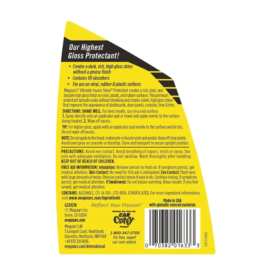 Meguiar’s Ultimate Insane Shine Protectant is a high-gloss, non-greasy formula designed to restore and protect vinyl, rubber, plastic, and leather surfaces with a deep, wet-look shine. Infused with advanced UV inhibitors, it prevents fading, cracking, and discoloration while repelling dust and dirt. Perfect for dashboards, door panels, tires, and exterior trim, this versatile protectant delivers long-lasting brilliance without silicone residue.